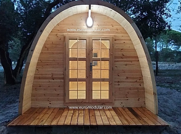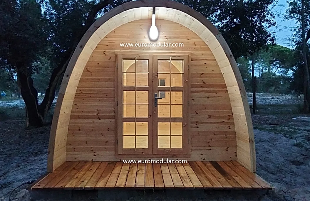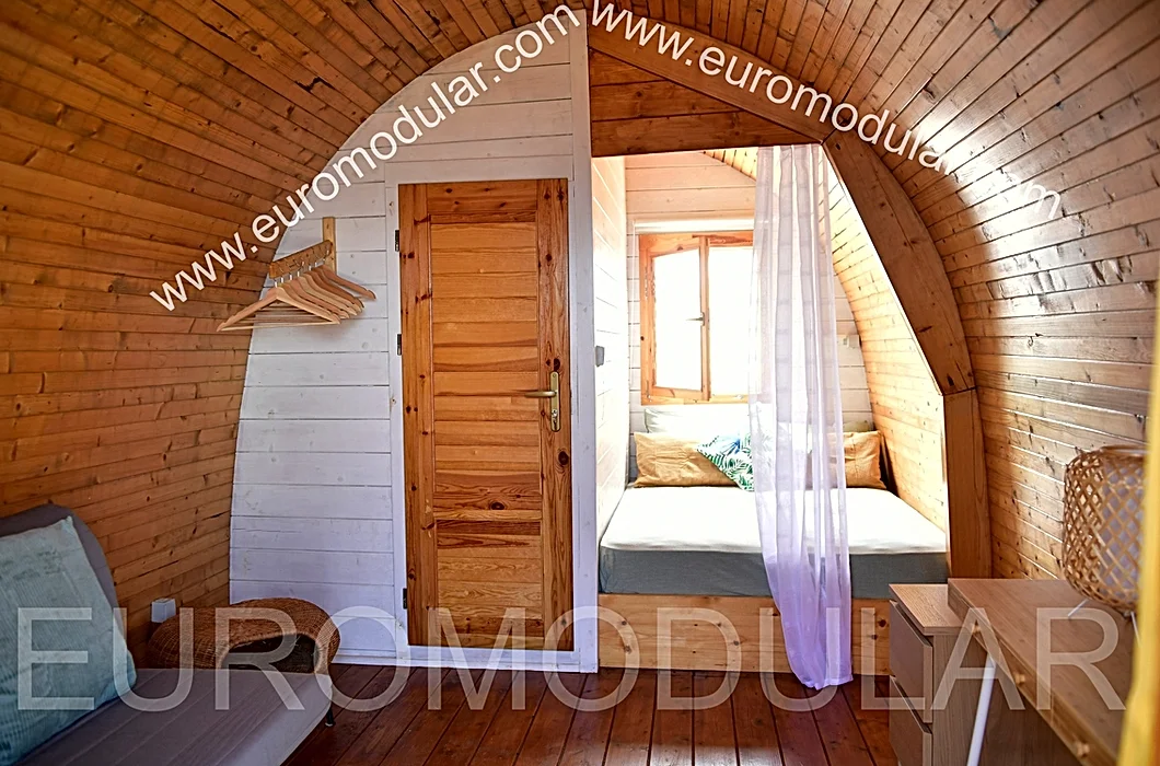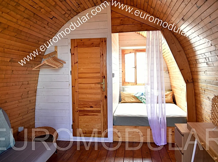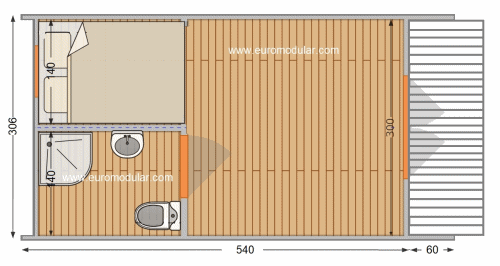 O T0+WC modelo 18 dispõe de 2 divisões interiores. Paredes em madeira de pinho/abeto nórdico com espessuras de 28 ou 44mm. Soalho em madeira de pinho/abeto nórdico com espessura de 19mm. Este modelo oferece a oportunidade de desfrutar do ar livre com o conforto dum aconchegante alojamento local. A casa de banho privativa faz deste, o modelo mais requisitado da “companhia”.
